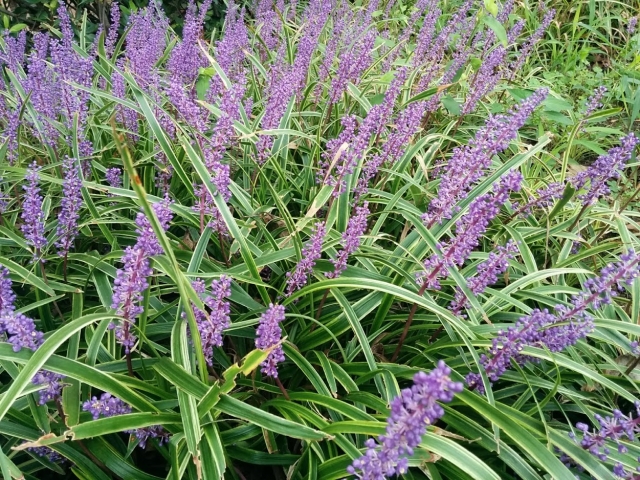 | ヤブラン | ・日陰に強い ・常緑性で葉が美しい ・夏から秋に紫や白の穂状の花を咲かせる | ・地下茎で増えるが、ツワブキほどの猛烈な繁殖力はない ・葉の形が細長く、異なる印象を与える |